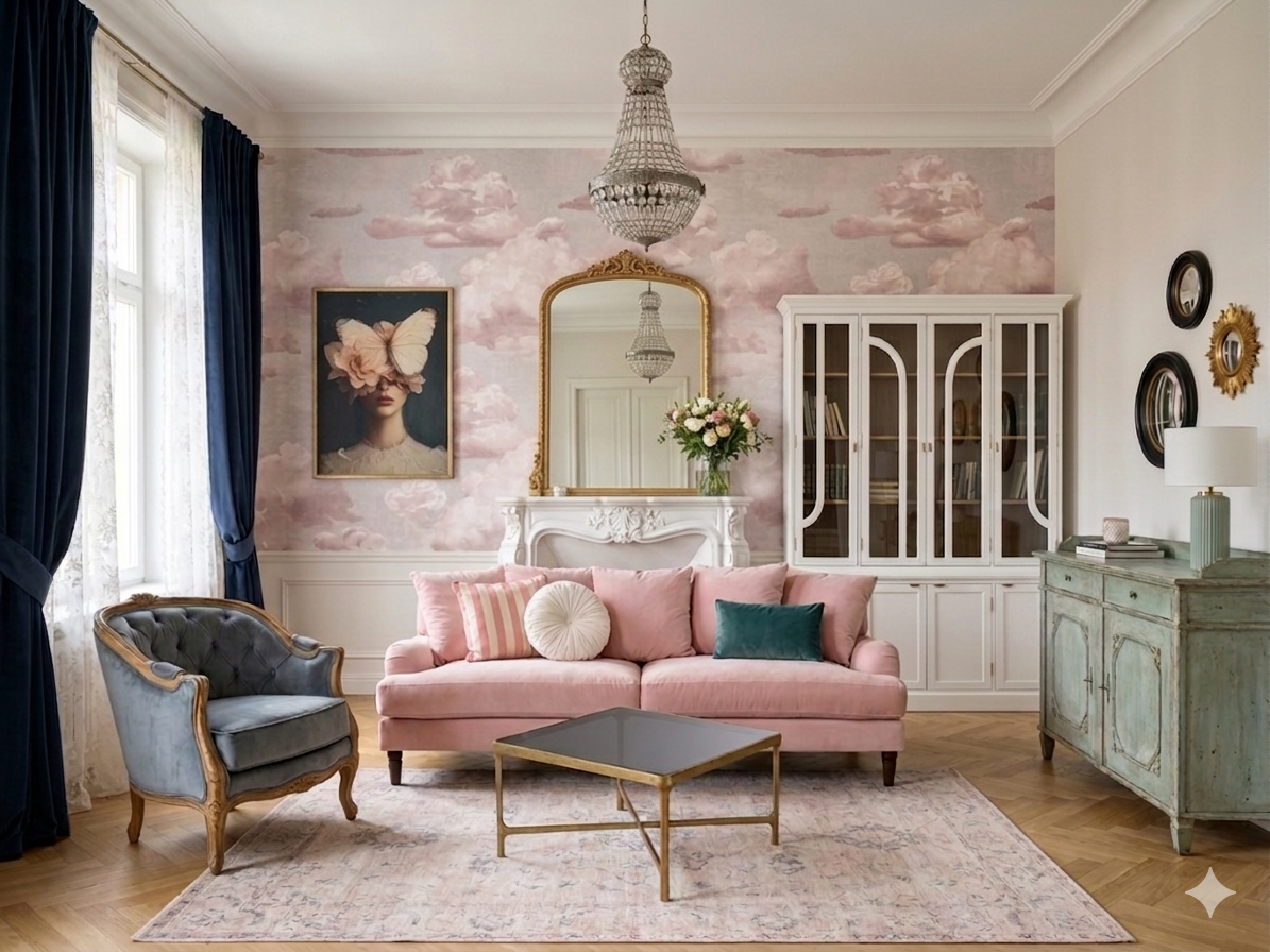 On évite la surcharge décorative. Mieux vaut peu d’objets, mais bien choisis : un tableau (de nature ou un portrait si on veut rester plus « puriste »), un beau miroir doré (pièce forte), quelques cadres élégants (noir, doré ou bois) et des objets de déco triés (moins nombreux, mais plus qualitatifs).