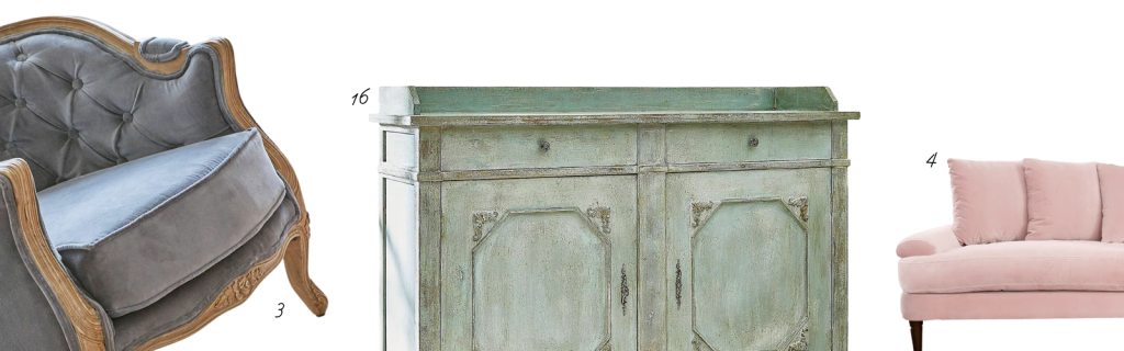 Arrêtons nous un instant sur ce magnifique buffet (16) au charme classique revisité. Il présente en effet tous les codes du style : des moulures décoratives, une forme structurée et symétrique et des pieds travaillés. Petit plus : sa couleur vert patiné et son effet vieillit qui apportent de la personnalité tout en restant chic.
