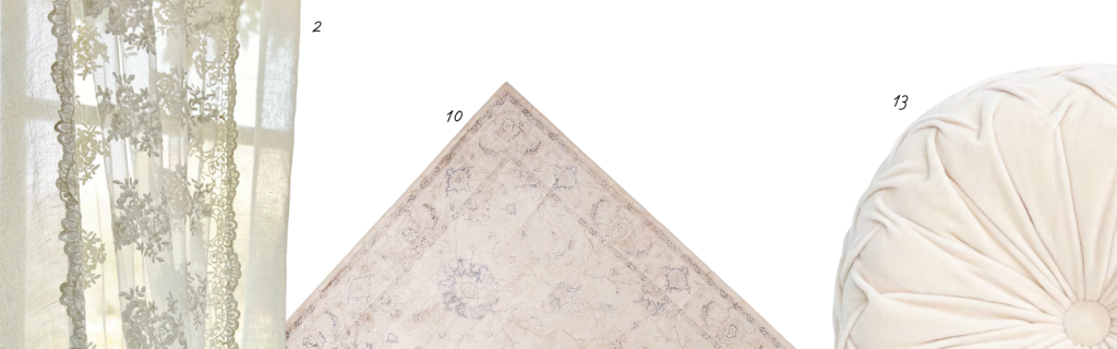 J’ai trouvé ce coussin rond de 35cm de diamètre (13), parfait pour le thème. Son plissage fait main rappelant une fleur (thème de prédilection dans le style classique), la douceur du velours et sa couleur beige qui se marie avec tout.