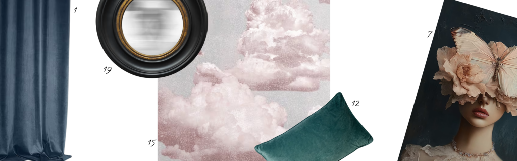 On ajoute des touches élégantes avec un bleu profond, du terracotta ou de l’ocre. Ces couleurs vont casser le total look bonbon et apporteront du caractère. C’est ce que j’ai fait ici avec ces doubles rideaux en velours couleur orage (1), le coussin vert canard (12) et le miroir médaillon noir (19).